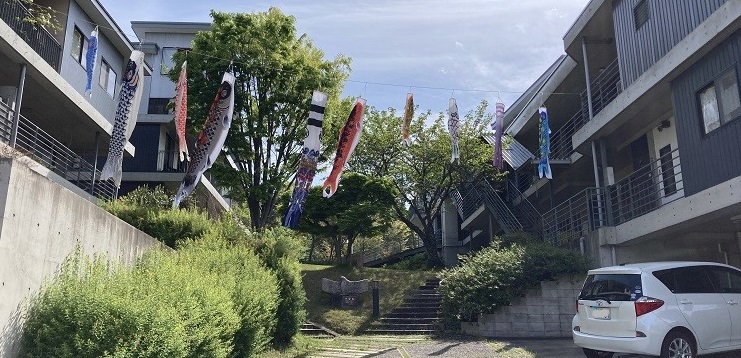 今年もつなねの鯉のぼりが上がりました。歩道を通る小さな子供連れの親子が、指を差しながら眺めていきます。