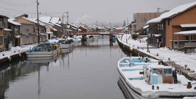 新湊の街並み 瑞龍寺を訪れた翌日、射水市新湊を散策しました。新湊は、日本のヴェニスと呼ばれるように、全長約3㎞の内川(運河?)の両側に古い家屋が並び15本の橋が架かる、水運と街とが隣接したどこか懐かしい街並みで有名です。大雪で訪れる人もまばらでしたが、橋をいくつか渡ったり、内川沿いの道を歩いたりと、運河の街を満喫しました。