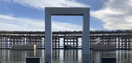 この前の日曜日、金廻四間門樋(かなまわりしけんもんぴ)を見学してきました。以前ブラタモリで紹介されて以来、ぜひ実物を見てみたいと思い、岐阜県海津市にある海津市歴史民俗資料館を訪れました。金廻四軒門樋とは、明治中期に建造された大型の木造排水施設(逆水留め樋門)の名称です。この地域は、揖斐川、長良川、木曽川が合流するいわゆるゼロメートル地帯で、かつては輪中(わじゅう)と呼ばれた堤防で囲まれた農地が点在していた場所です。ここではしばしば川の水位が土地の高さを越え洪水が起こりました。そのため洪水から土地を守ることと、また平時においては土地の排水が重要課題でした。この樋門は、輪中の排水のための排水路(大江川)が揖斐川に流れ込む合流地点にありました。平時の揖斐川の水位が低いときには、排水路の下流への流れによって扉が開いていて、また揖斐川の水位が土地より高くなると、逆流しようとする水圧により扉が自動で閉まるという仕掛けです。この扉は一方向の流れにしか開かない、いわば心臓の弁のような働きになっています。ちなみに金廻とは旧地名のこと、四間は門の間口が4間の意味、門樋は堤防の下を通る逆流防止付排水路のことです。